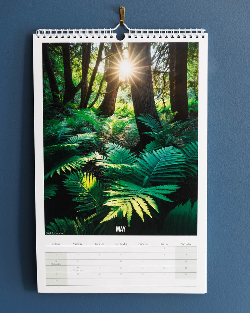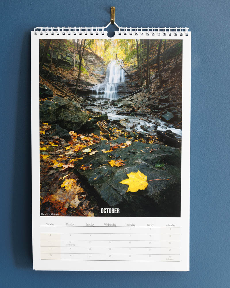 This portrait orientation wall calendar is custom designed by me every year. It includes 12 high-quality images which match the month they represent, and each set of dates includes monthly holidays for the Ontario region. Please note – holidays differ depending on where you reside, so the holidays referenced here may not match your region!