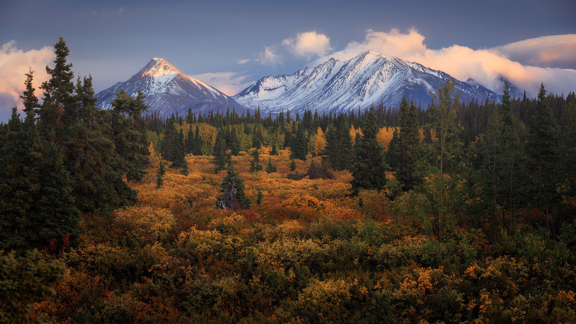 When my friend and I and I landed in the Yukon, after considerable delays and challenges, our first stop was Kluane National Park. We arrived only minutes before sunset and immediately took off down the highway looking for scenes of interest. Much of the park was covered in thick clouds, but for some limited areas in the front range, that cloud would break like waves against the towering, snow-covered, mountains.