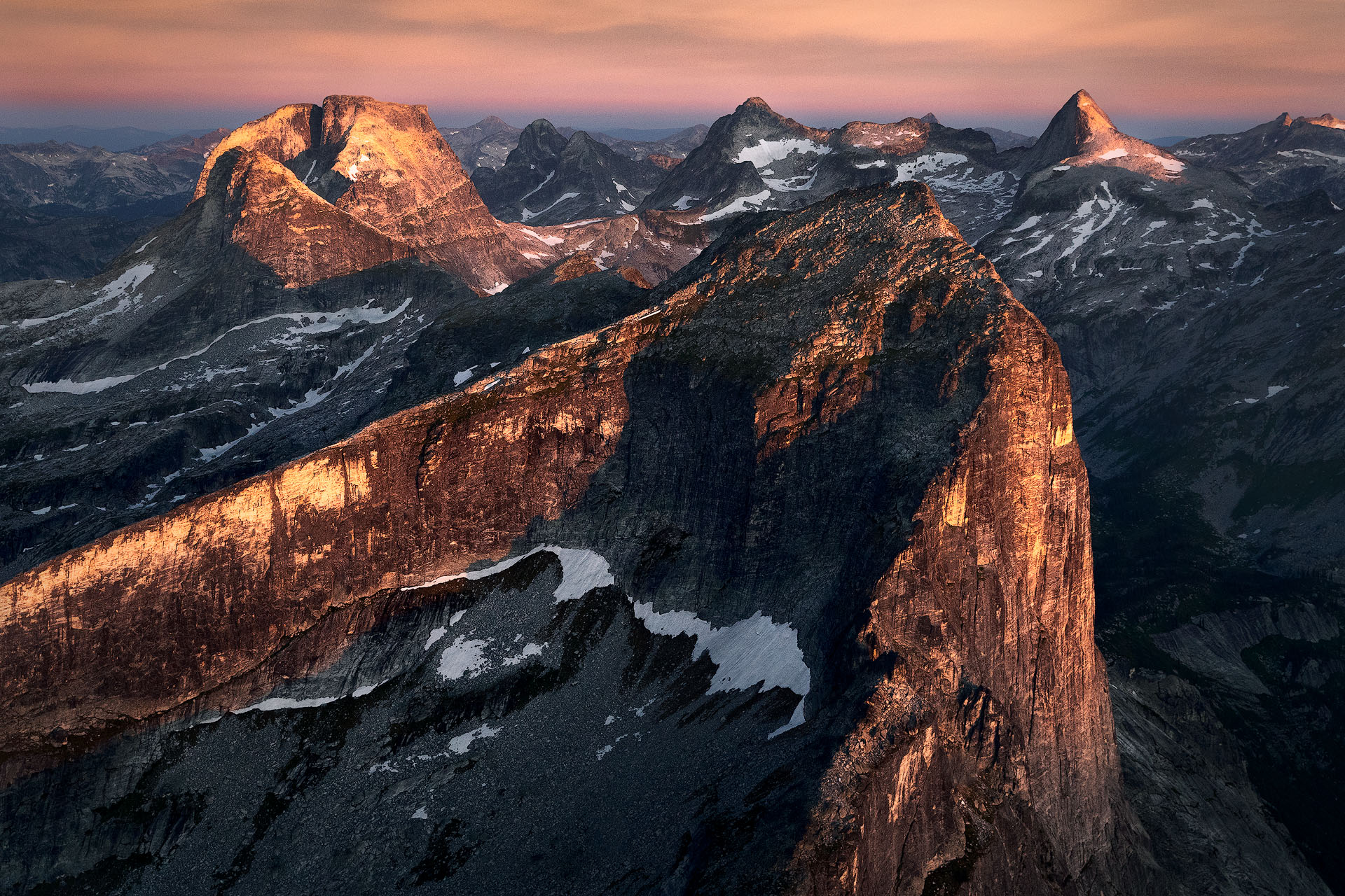 There’s nothing like flying over dramatic peaks and watching the sun catch them early in the morning. this was once such time where I found myself just shooting in all directions to take in as much of that glorious light as possible! This was one where three prominent peaks really put on a show at once. What a treat over Valhalla Provincial Park in the British Columbia interior!